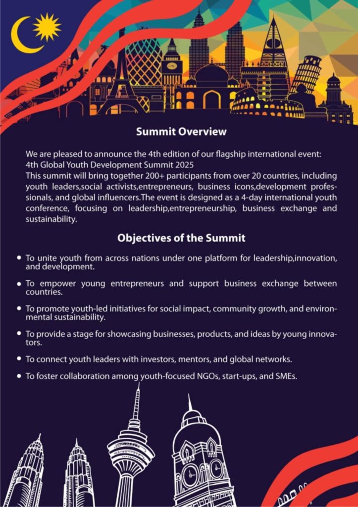 We are pleased to announce the 4th edition of our flagship international event: 4th Global Youth Development Summit 2025 This summit will bring together 200+ participants from over 20 countries, including youth leaders,social activists,entrepreneurs, business icons,development professionals, and global influencers.The event is designed as a 4-day international youth conference, focusing on leadership,entrepreneurship, business exchange and sustainability.